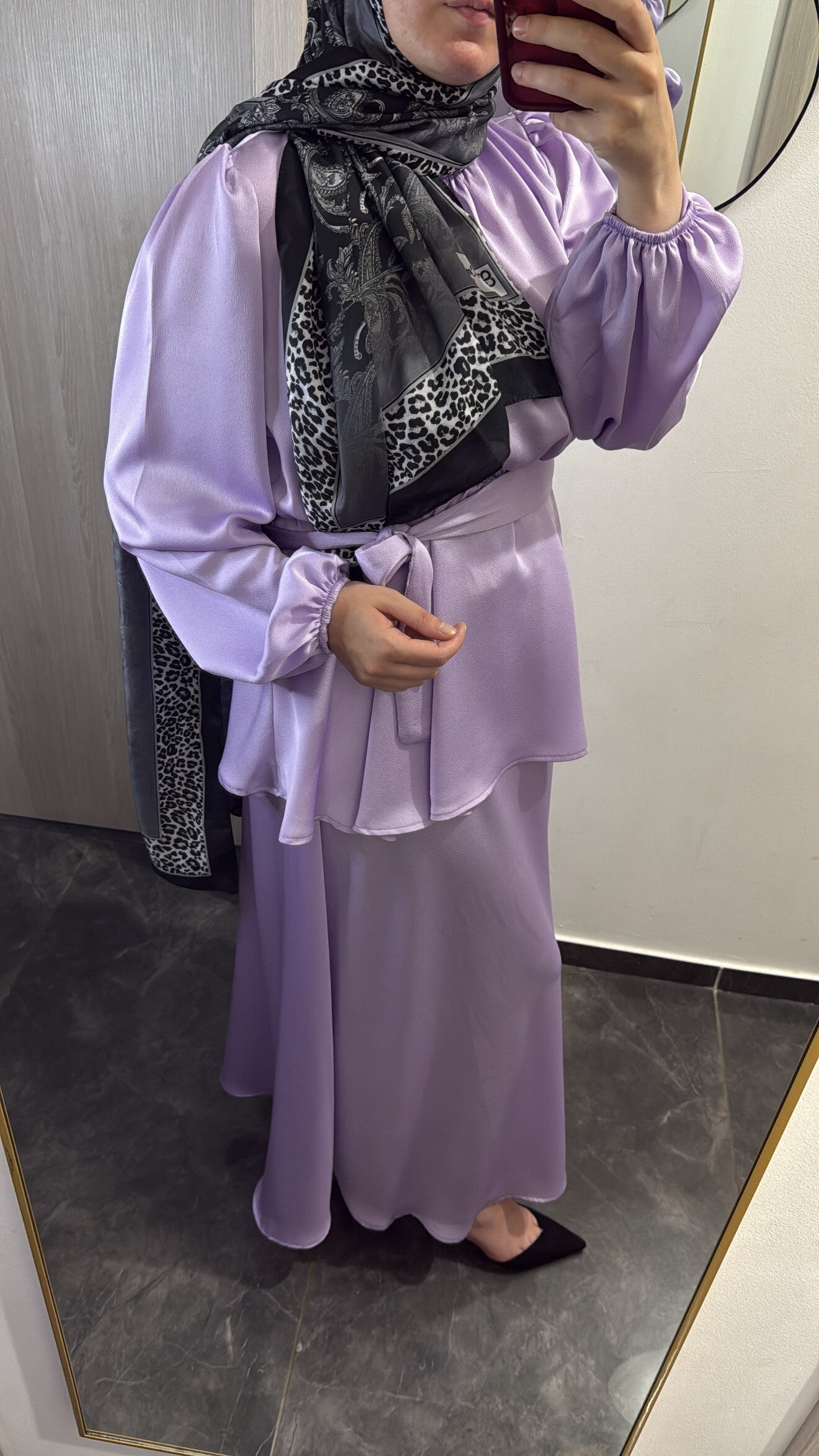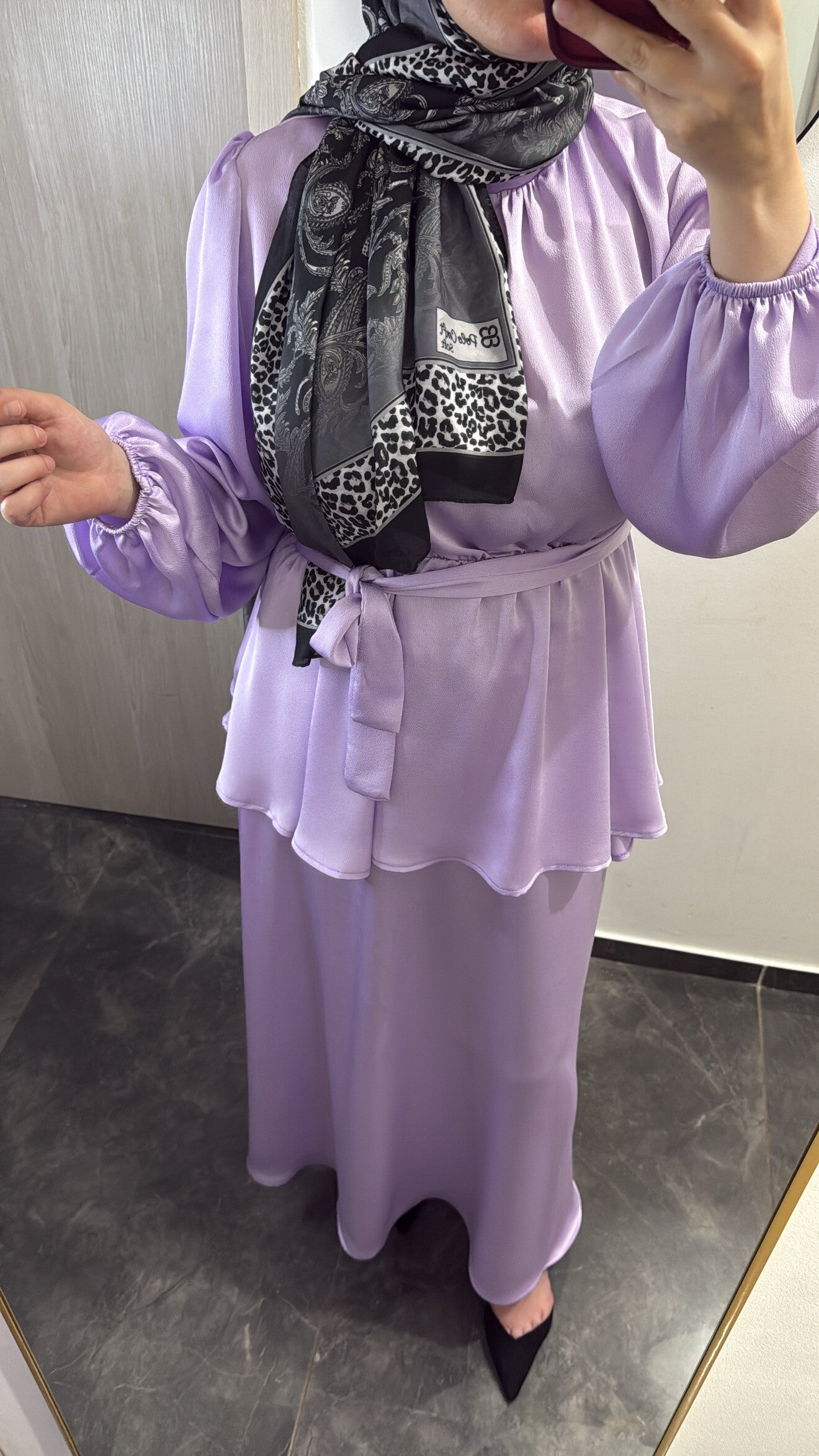 Laissez-vous séduire par cette ensemble, pensée pour sublimer toutes les silhouettes avec raffinement. Son tissu fluide est délicatement contrasté par un voile à motifs paisley gris anthracite, qui apporte une touche chic et distinguée à l’ensemble.