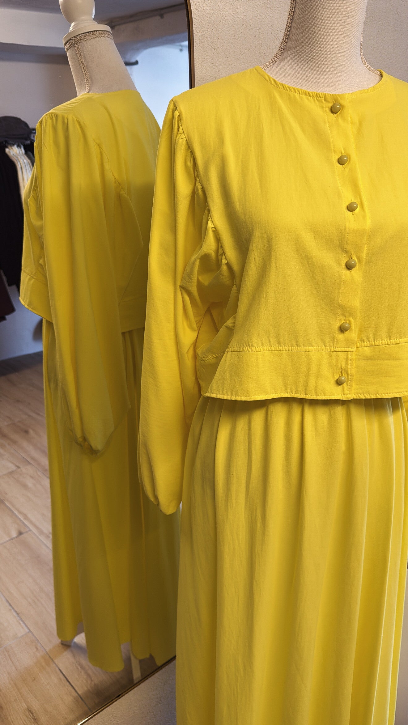 • Haut à manches longues bouffantes, boutons recouverts ton sur ton