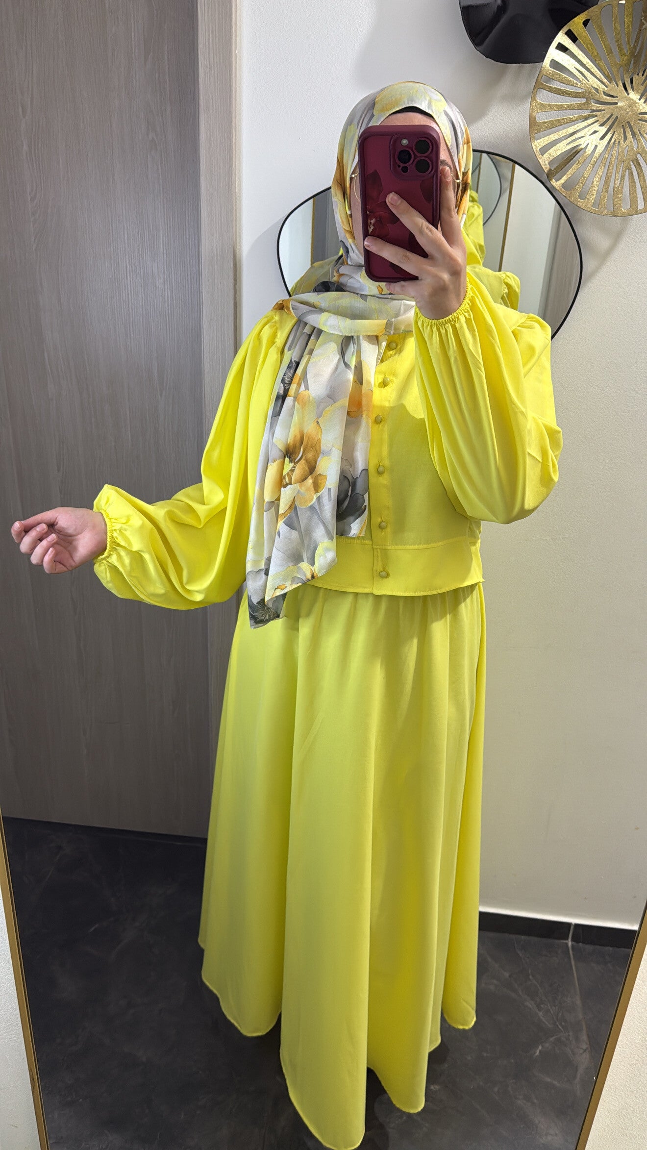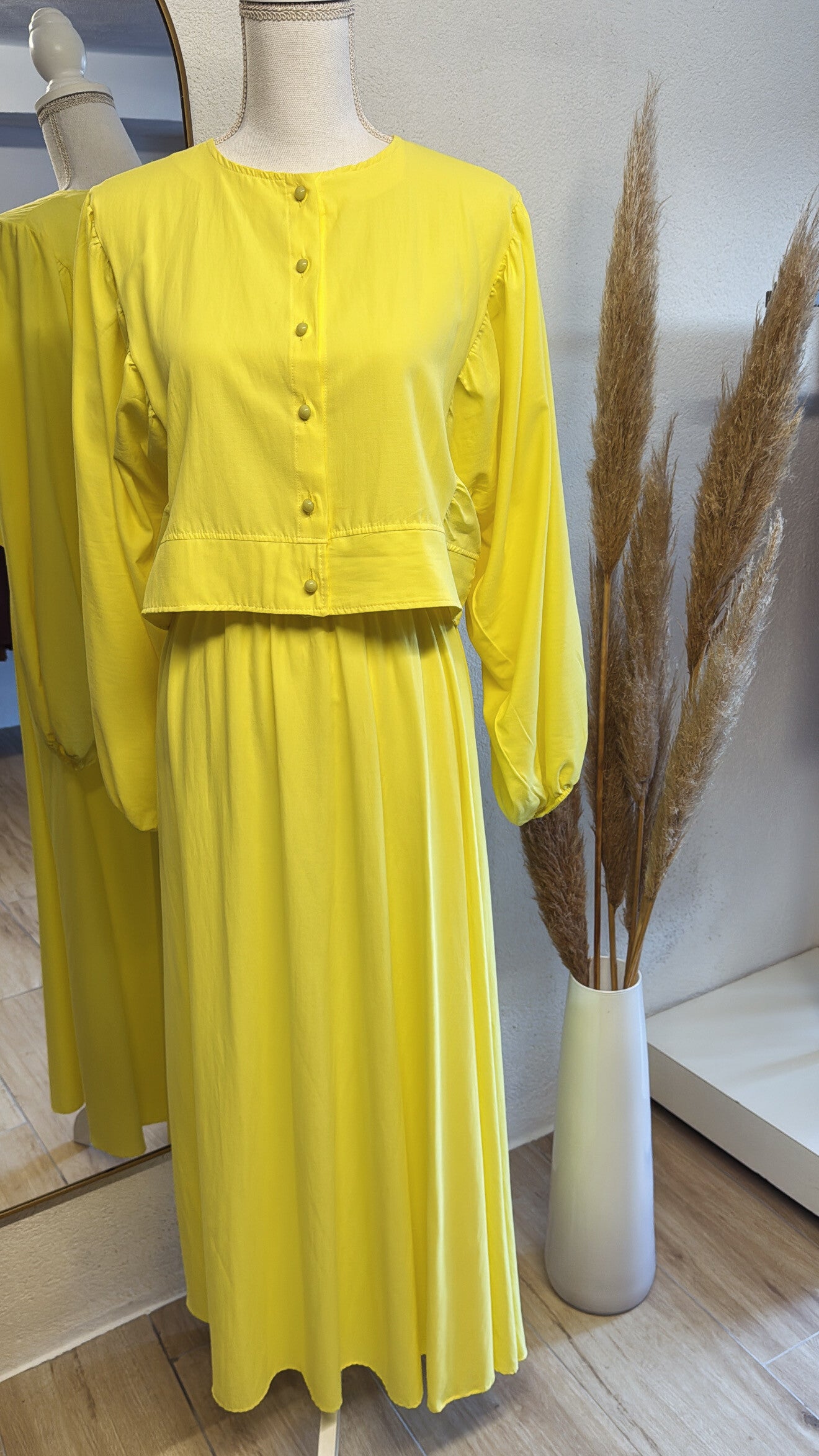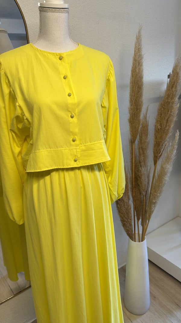 Laissez-vous séduire par cet ensemble éclatant et raffiné, composé d’un haut boutonné à manches bouffantes et d’une jupe longue fluide.