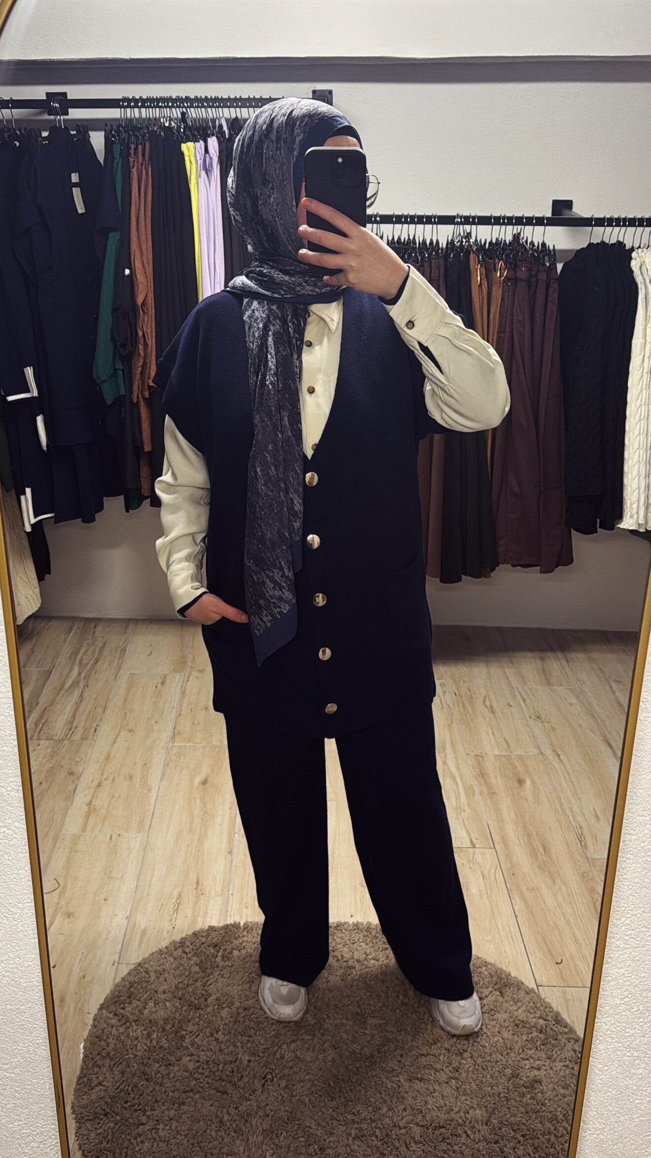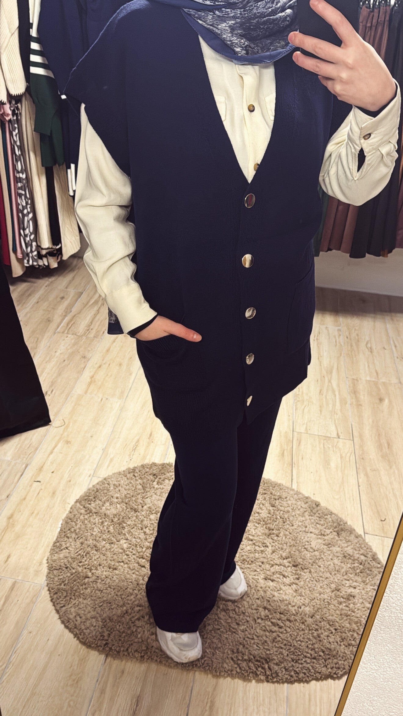 Craquez pour cet ensemble bleu marine en maille triko, à la fois moderne, élégant et ultra confortable. Composé d’un gilet sans manches boutonné et d’un pantalon fluide, il offre une coupe ample idéale pour un style modeste et tendance.